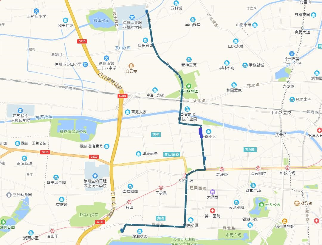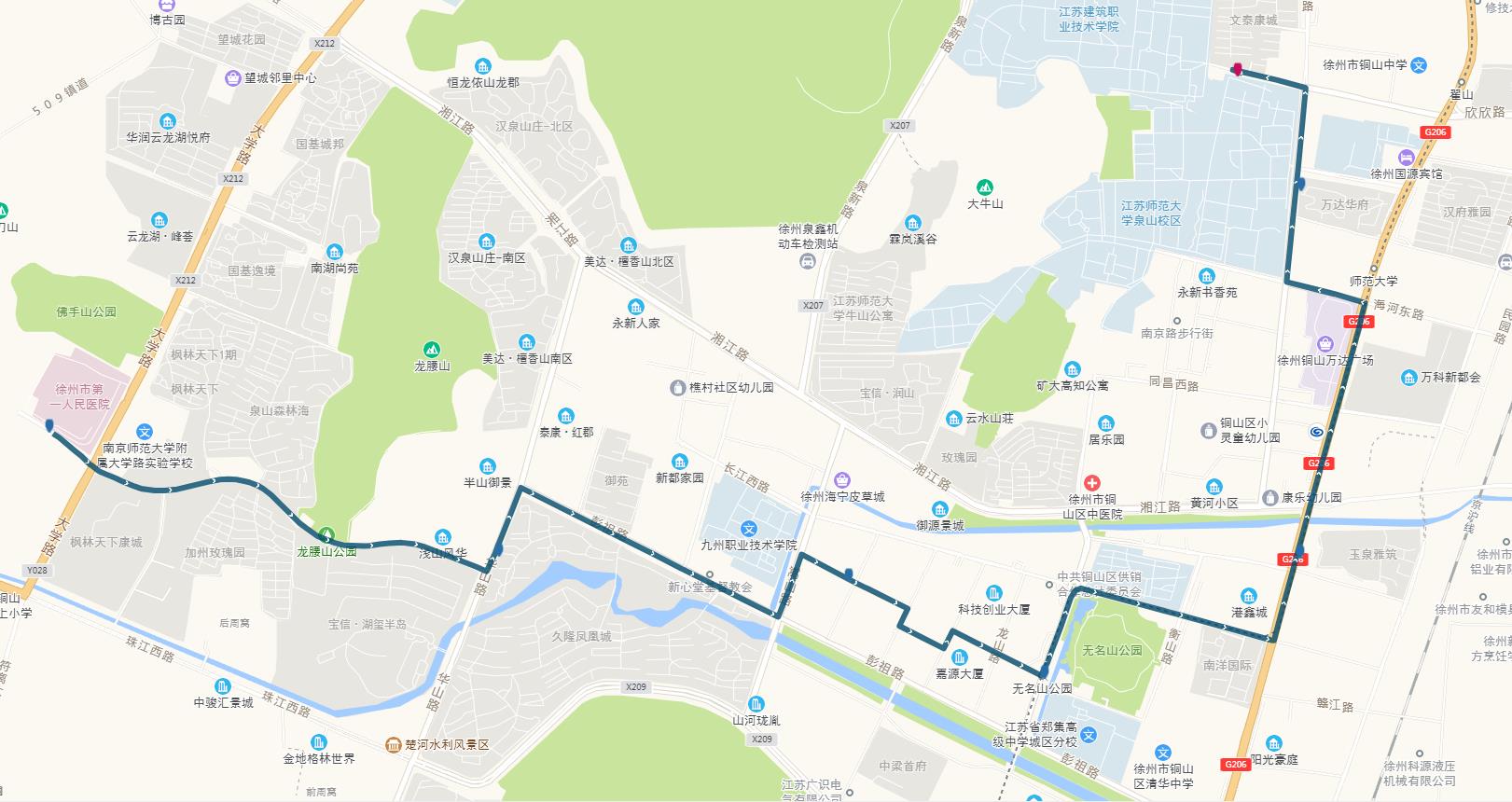 線路站點:建筑學院、江蘇師范大學、師范大學地鐵站、萬科新都會、港鑫城、南洋國際、康樂園南門、無名山公園地鐵站、銅山區(qū)政府、楚河金茂府、嵩山路、銅山新區(qū)總站、久隆鳳凰城北門、保利迎賓館、龍腰山公園、泉山森林海、第一人民醫(yī)院南門。